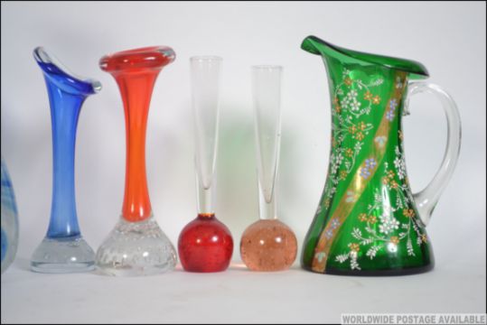 A collection of retro and vintage studio glass to include a green hand painted Victorian jug and a silver over lay bowl. Please see images. The tallest measures 32cm high.