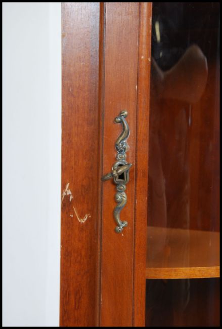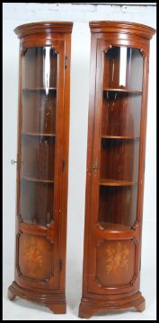 A pair of antique style walnut marquetry inlaid bow front corner cabinets of good column shape and form. Measures: 200cms high x 38cms wide x 38cms deep.