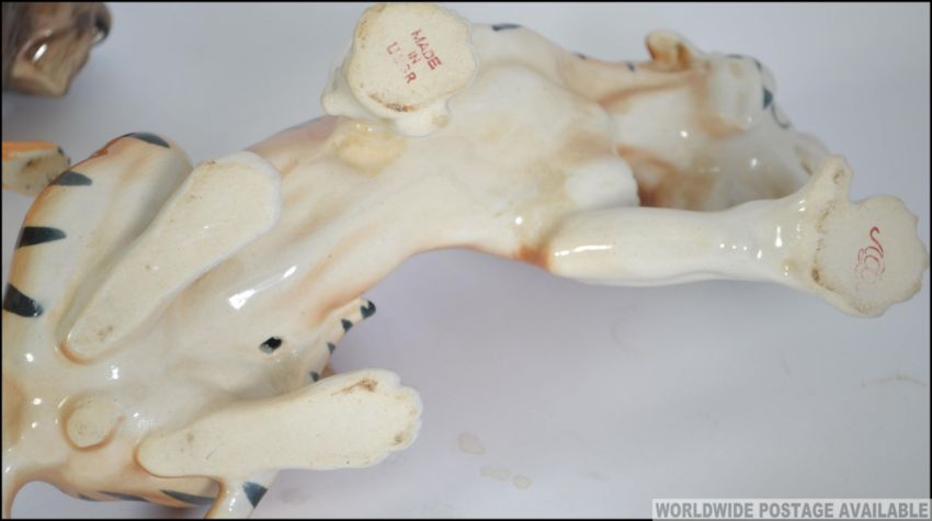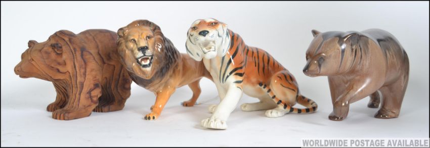 A collection of ceramics to include a Beswick prowling Lion, a USSR Tiger, ceramic bear along with Black Forrest style Canadian carved bear. Lion measures 23cms long.