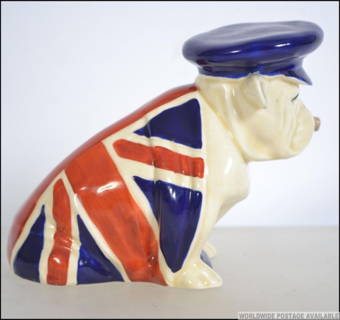 An original 1941 medium royal Doulton figure of a ' Churchillian ' bulldog, modelled wearing trinity cap and draped in a Union Flag. No signs of damage or repair a very well looked after example. Stamped to base. Condition Report - No signs of damages or repair, a very well looked after example. Measures 12cms high.