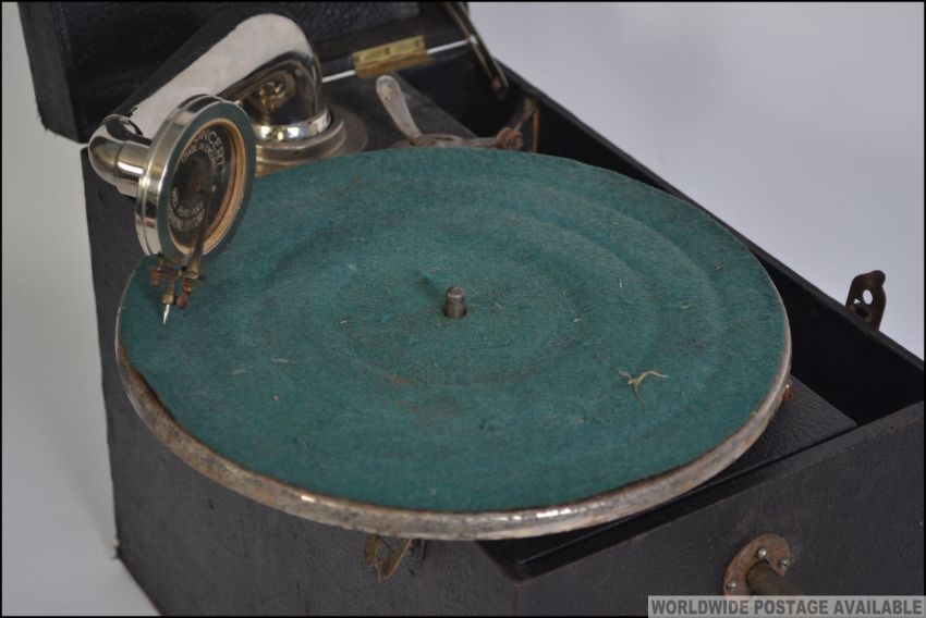 An early 20th century portable cased Concert Gramophone. The vinyl case having a hinged top containing all the components for playing records. Please see illustrations. Together with a spare gramophone motor.