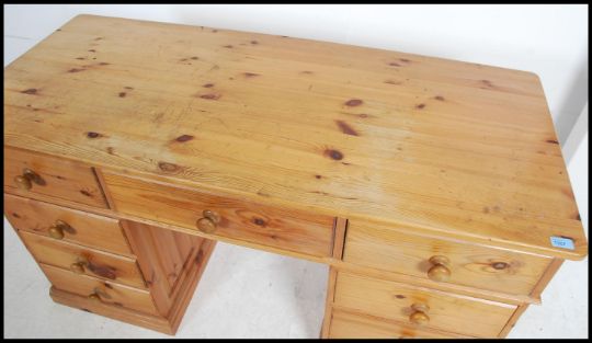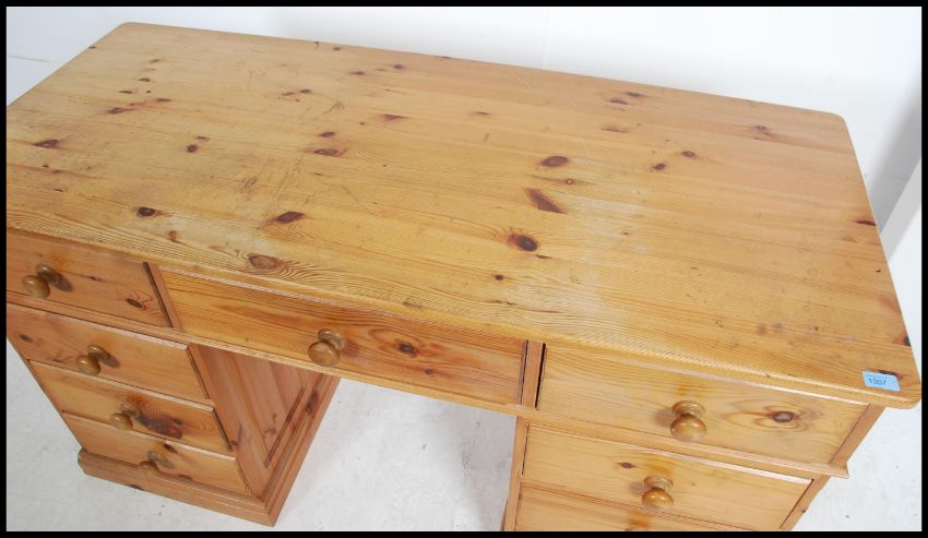 A contemporary antique style pine twin pedestal desk raised on a plinth base with drawers above. All with knob handles. Dismantles to 3 pieces. Measures: 79cms high x 140cms wide x 61cms deep.