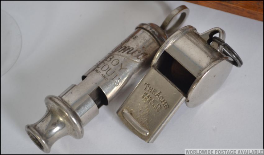 Two early 20th century brass and oak postal scales with weights together with 2 whistles, one a Scout whistle, the other an Acme and a pair of pinz nez glasses. Measures 11 cms high.