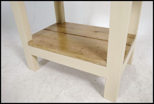 A 20th century upcycled 20th century metal bound beech butchers block, raised on a painted frame united by stretchers. Measures 84cm high x 76cm wide x 50cm deep.