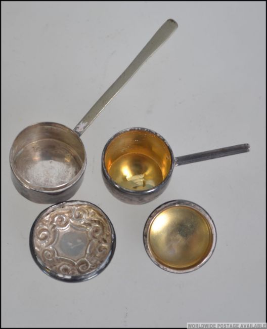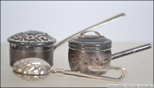 A pair of miniature silver hallmarked dolls house furniture lidded saucepans, both pans having Birmingham assay marks along with a silver 925 possible napkin holder having a scallop clasp. Measures 6cms long. Total weight 20.8g.