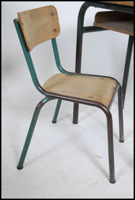 A 1950's vintage mid century tubular metal and beech wood childs school desk and similar chair. enamelled metal frame with shaped top to the desk. Measures 70cm high x 62cm wide