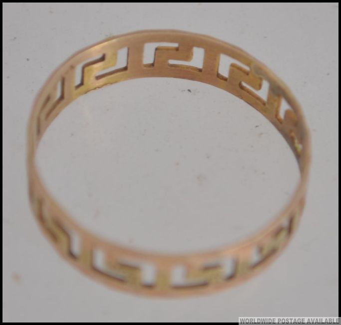 A pair of turquoise and cultured pearl 19th century earrings set upon a gilt metal background along with a gold metal Greek key ring
