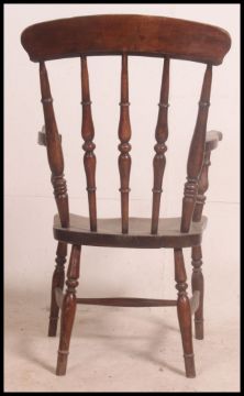 A Victorian beech and elm Windsor chair having turned legs with saddle seat beneath bobbin turned back rests and shaped elbow supports
