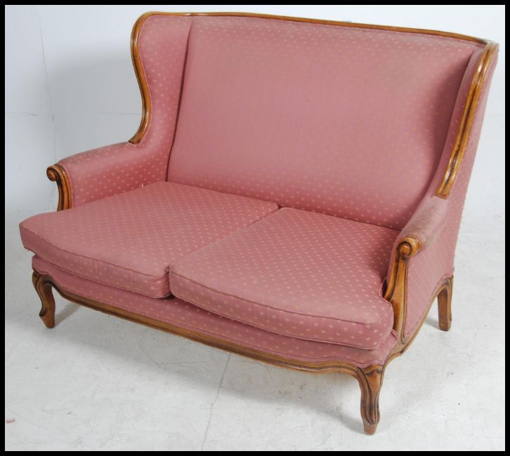 A 20th century French canape - 2 seat fauteuil sofa having a reeded show wood walnut frame with pink upholstered frame. Measures: 92cms high x 111cms wide x 89cms deep.