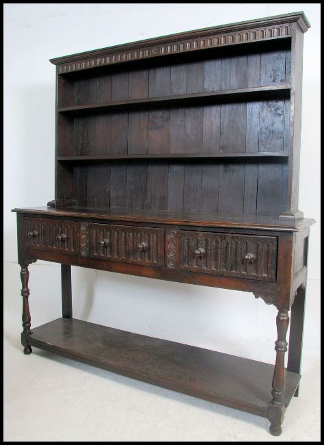 A good mid century Jacobean revival solid oak carved welsh dresser sideboard being raised on turned legs with pot tray base having single drawers above. Further atop, an upright plate gallery rack. Dismantles into 2 pieces. Measures 185cm high x 155cm wide x 45cm deep.