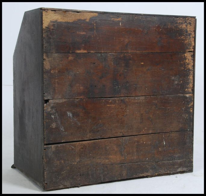 A Georgian 18th century mahogany bureau having appointed interior within raised over bank of drawers having brass swan neck handles, base with restoration required, parts in drawer. Measures: 90cms high x 93cms wide x 52cms deep.