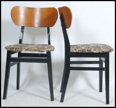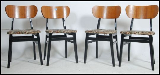 A set of 4 1960's believed G-Plan teak and ebonised butterfly shaped dining chairs with ebonised frames and overstuffed seats. Measures 77cm high x 43cm wide x 46cm deep.