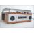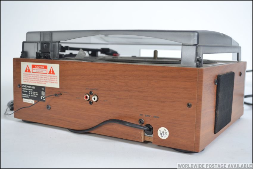 A contemporary 20th century stereo integrated turntable amplifier tuner, with a smoked plastic lid.