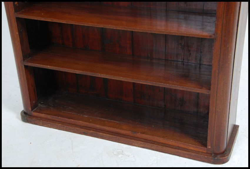 A Victorian mahogany open window bookcase with shaped sides and plinth base and top having fixed shelves. Measures: 99cms high x 99cms wide x 25cms deep.