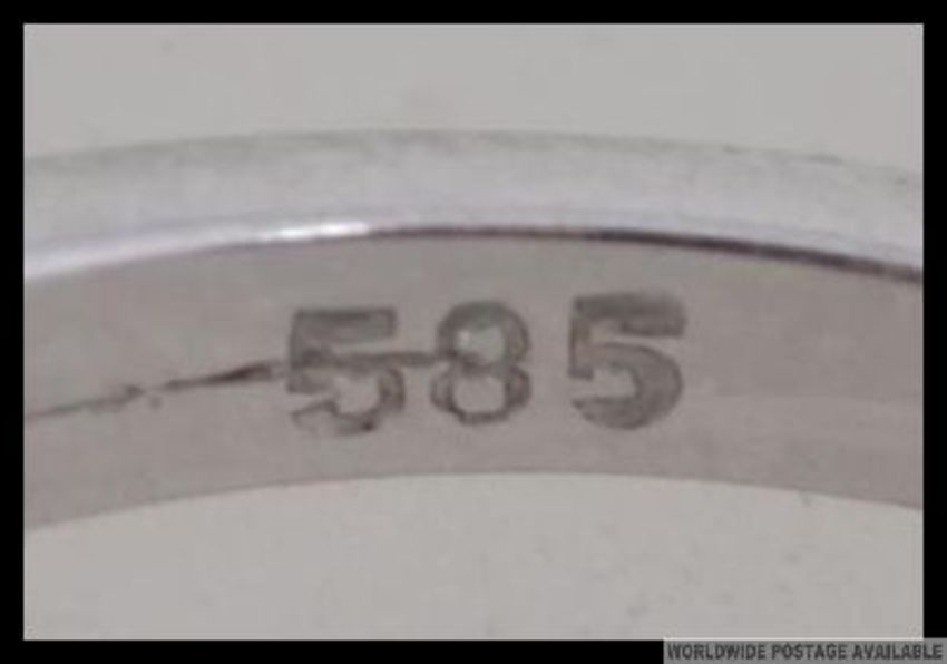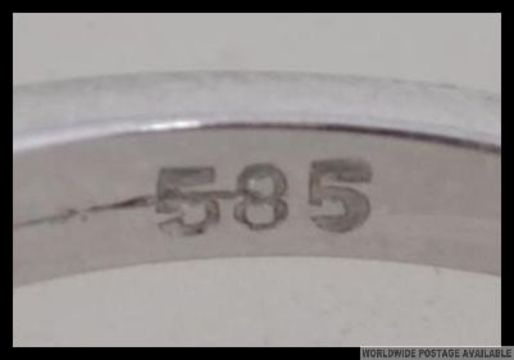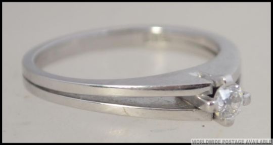 A 14ct white gold single stone ladies diamond ring. The round cut diamond approx 10pnts set to a pierced shank. Stamped 585 to the inside shank. Weight 3.6g / Size N.5