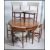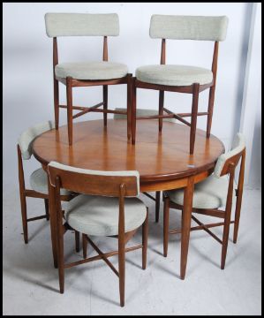 A mid-20th century G-Plan teak circular pull out extending dining table with a single additional fold away leaf, raised on four simple turned tapered legs, together with a set of six curved and upholstered bar back dining chairs with further circular upholstered pad seats, raised on turned tapered supports united by X-framed stretchers. Measures 72cm high x 121cm wide x 121cm deep.