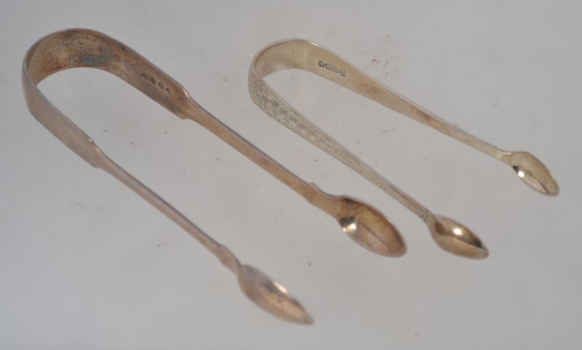 A pair of 19th century Georgian silver hallmarked sugar tongs makers William Sweeting. London 1809. Total weight 43.5g Together with another pair of tongs by FP, Chester 1887. Total weight 19.4g