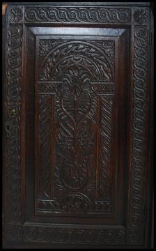 A Victorian large oak corner cabinet having carved details to the fielded panel. Embellished columns either side. Single door housing shelves set within. Measures: 117cms high x 75cms wide x 46cms deep.