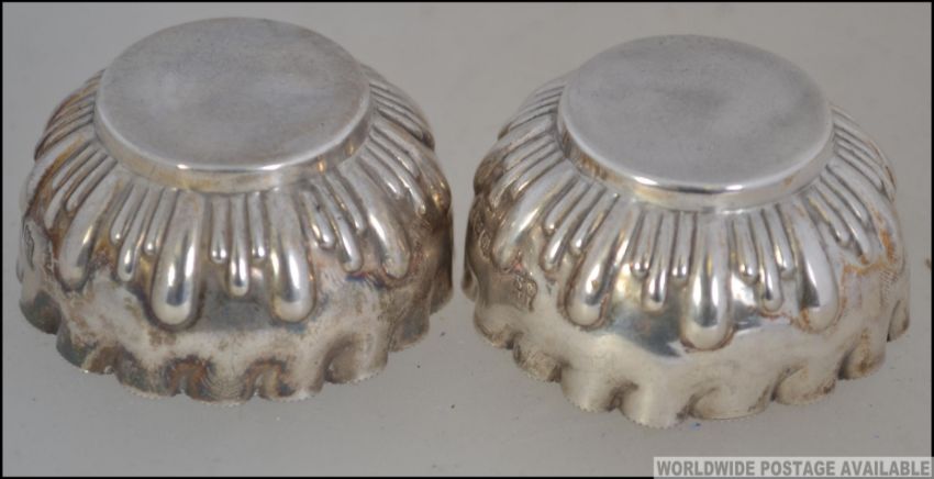 A pair of silver hallmarked table salts. Rococo form being hallmarked for Sheffield 1899. Total weight 40.5g. Measures 5cm wide.