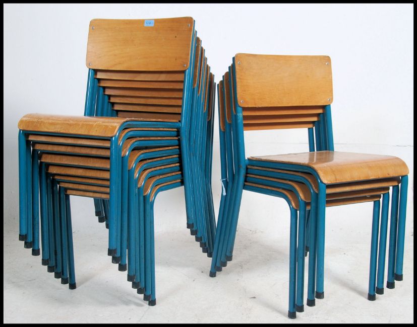 A set of twelve vintage industrial mid 20th century church / village hall stacking chairs. having a stunning teal painted tubular frame with panel seat and back rest.