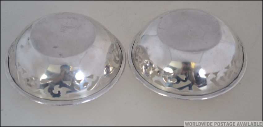 A pair of silver fret worked hallmarked peanut dishes. Silver hallmarks for Birmingham 1902 by Charles S. Green & Company. Weight 38.7g. Measures 8cm wide.