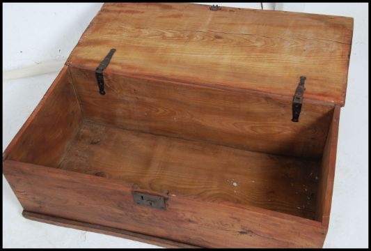 An 18th century carved elm / oak blanket box - chest coffer having a plinth base with hinged top above, carry handles to the sides. Measures 32cm high x 96cm wide x 45cm deep.