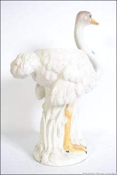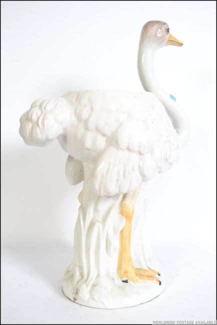 A vintage retro 20th century kitsch Staffordshire type Ostrich / Emu ceramic stick stand - planter set upon a naturalistic plinth. Measures H63cm