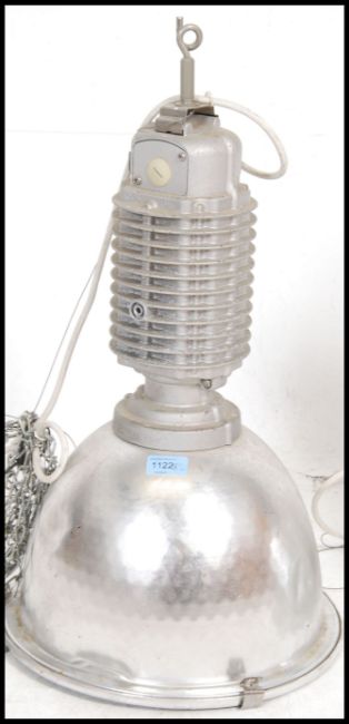 A pair of large 20th century factory industrial tall pendant factory lights, fitted with transformers each of polished metal with half globe shades, the inside shades being honeycombed