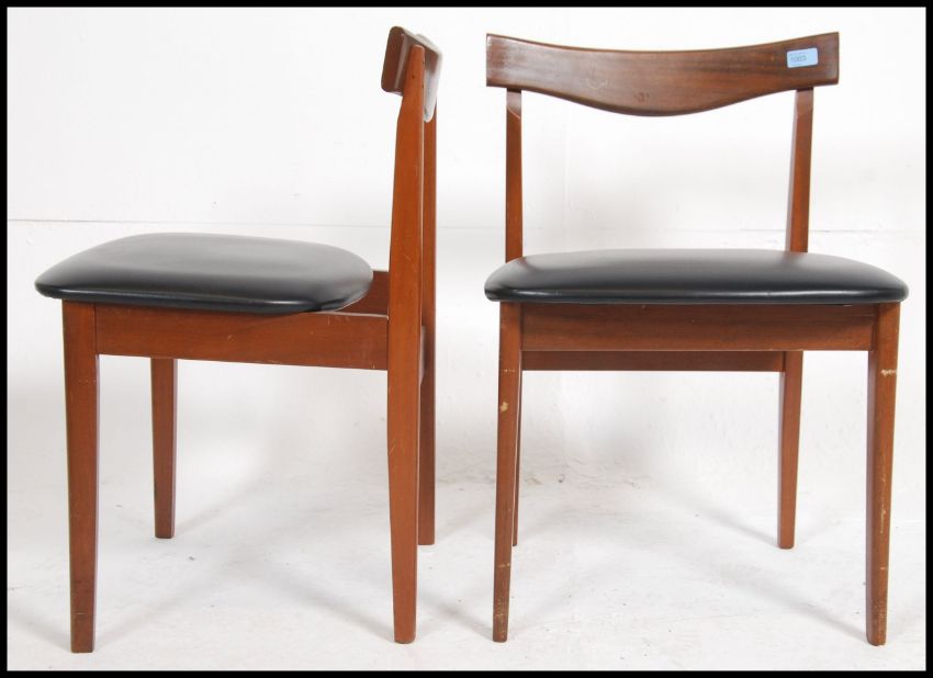 A set of 4 1970's teak and faux leather Danish influence ' propeller ' back dining chairs being raised on shaped legs with black vinyl seat pads. Measures: 69cms high x 49cms wide x 47cms deep.