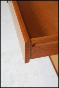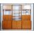 A 1970's retro G-Plan modular teak wood room divider bookcase having 3 sections to include sliding door cupboards and drawers with the upright backs a combination of shelves and cabinet. Measures: 198cms high x 230cms wide x 46cms deep.
