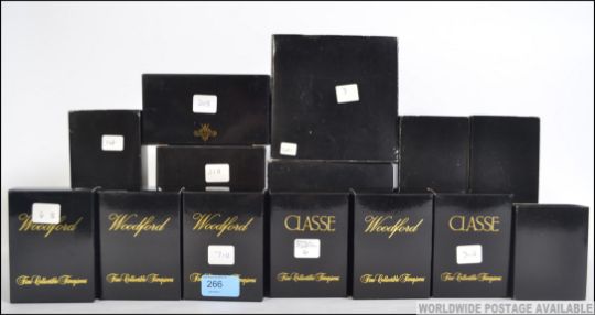 A collection of boxed Woodford miniature brass clocks, all of varying style and designs, each within the original boxes