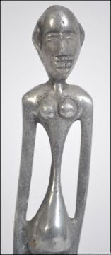 An African fertility sculpture of a pregnant woman made from aluminium on a square plinth base. Measures 32cms high.