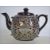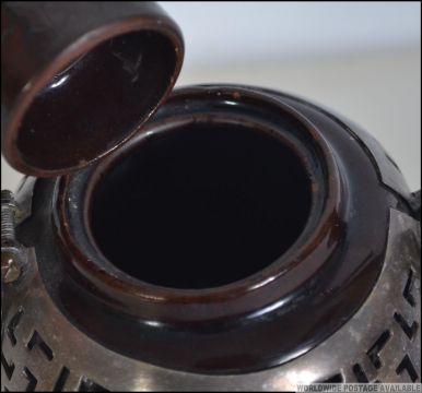 An early to mid 20th century ceramic teapot having a stunning Elkington Plate Co fret pierced cover. Measures 11cm high. Total weight 422.9g.