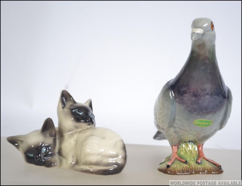 A fantastic vintage Beswick ceramic study of a grey pigeon with two bars to the wings impressed to the base Beswick 1383 along with a Beswick group of of cats impressed to the base Beswick 1296. The tallest piece measures 14cm high.