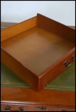 A Georgian style large mahogany twin pedestal office desk with green leather gilt tooled top having drawers to each plinth. Dismantles into 3 pieces. Measures: 80cms high x 160cms wide x 76cms deep.