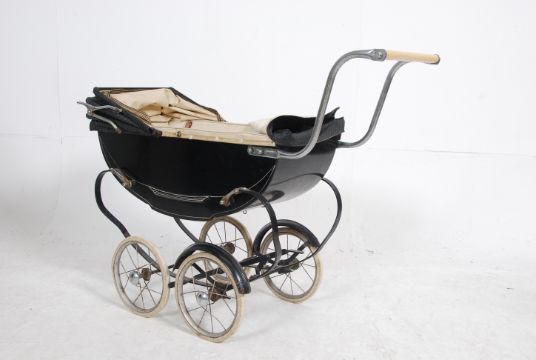 A vintage mid century black metal and canvas covered childs dolls pram by Swan. Wheels and brake in good order with cover etc