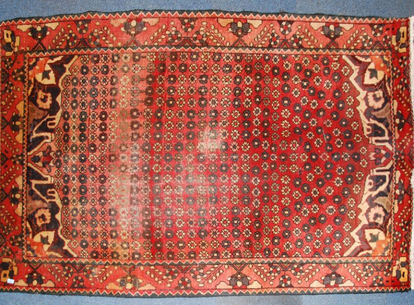 A 20th century Persian rug with unusual medallion design on red ground having stunning angular spandrels at each end with foliate tree of life borders. Measures 248cms x 153cms