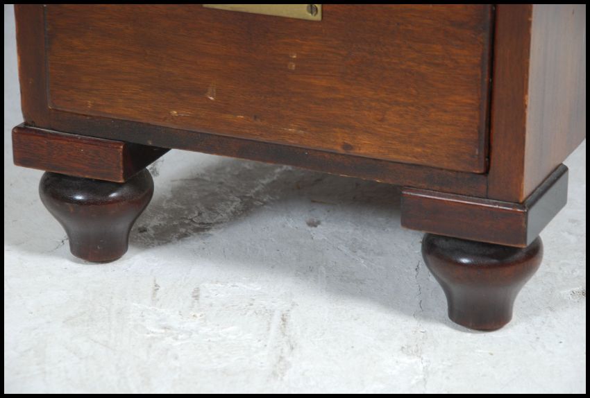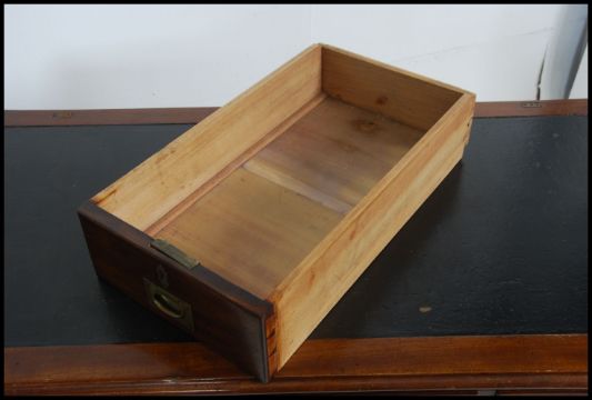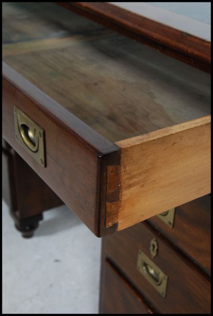A 19th century mahogany and brass campaign desk. The 3 part desk having plinth based pedestals, each with drawers having further drawers and desk top above. Inset brass handles and corner brass bracket work. Measures 78cm high x 110cm wide x 58cm deep.