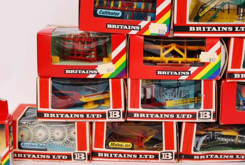 BRITAINS: A large collection of 15x original vintage Britains Farm Implements diecast models. All within the original boxes, mostly mint models. Numbers; 9537, 9544, 9548, 9541, 9538, 9535, 9549, 9553, 9539 etc.