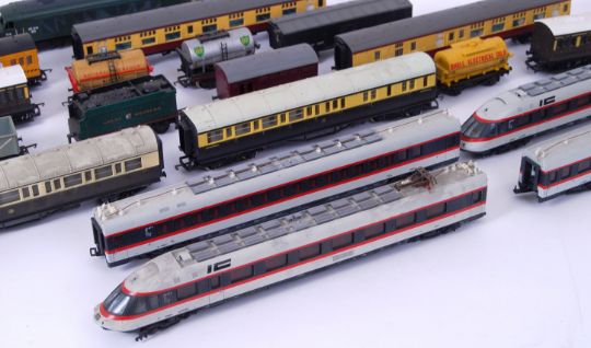 00 GAUGE: A collection of assorted 00 gauge railway trainset rolling stock, to include carriages, wagons, locomotives, 45016 Locomotive and others. Mostly Hornby, few others.