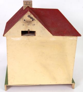 TRIANG DOLLS HOUSE: An original vintage mid-century likely Triang made dolls house. Painted fascia with tudor style eaves. With a small collection of furniture. Appears to have once been battery operated and partial remnants of the mechanism still exist. No makers marks. 43cm tall x 38cm wide x 28cm deep.