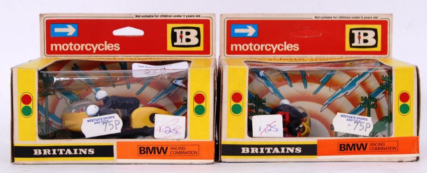 BRITAINS: Two original vintage Britains diecast model motorcycles - 9699 BMW Racing Combination. Both in original boxes.