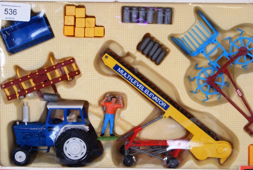 BRITAINS: A rare Britains Gift Set 9590 Ford 6600 Farm Tracor & Implements Set. Ex-shop-stock, contents mint. Box good to very good, plastic window with split. Complete.
