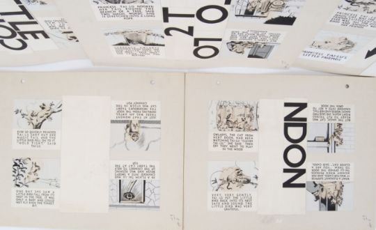 TV COMIC ORIGINAL ARTWORK: A collection of 5x rare original c1951 Hulton Press ' Princess Tai Lu ' cat artwork boards from TV Comic annual. Each depicting 4x Tai-Lu scenes, with text underneath. Original artwork for the TV Comic children's annual. 42cm x 33cm