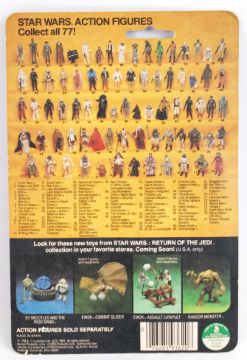 STAR WARS: An original vintage Star Wars 77 Back carded action figure of ' Greedo .' Mint on card. General Mills / Palitoy. Yellowing to bubble and crack / hole. Otherwise mint, on a near mint card.