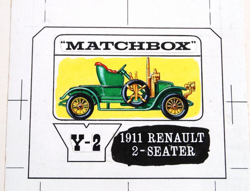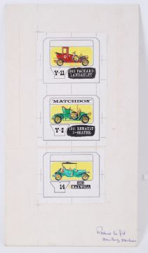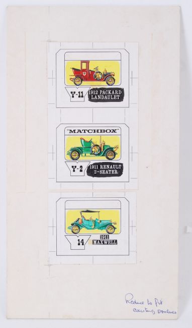 RARE MATCHBOX ARTWORK: A collection of original vintage artwork for Matchbox Models Of Yesteryear diecast models. Y-11 1912 Packard, Y-2 Renault Two Seater and Y-14 1911 Maxwell. All end panel artwork. Original watercolour paintings. Laid onto one printers board. 38x21cm