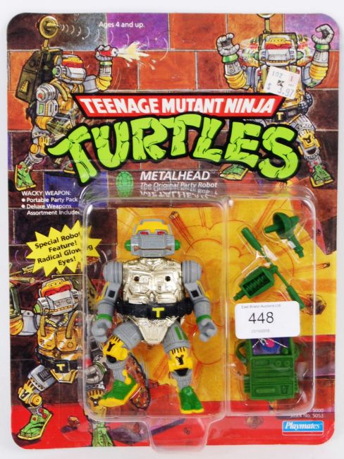 TEENAGE MUTANT NINJA TURTLES; An original Playmates made ex-shop stock Teenage Mutant Ninja Turtles carded action figure ' Metalhead '. 19 back. Mint, original card back. Sealed, unused. Unpunched.NOTE: From a large and impressive ex-shop stock 1990's Teenage Mutant Hero / Ninja Turtles carded action figure collection. Most are 'box fresh' and in very near mint to mint to mint+ condition. All flat cards, most unpunched. Buyers are reminded to satisfy themselves as to condition of individual lots prior to bidding, as condition on some, will vary. Rare collection.