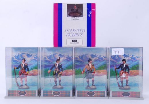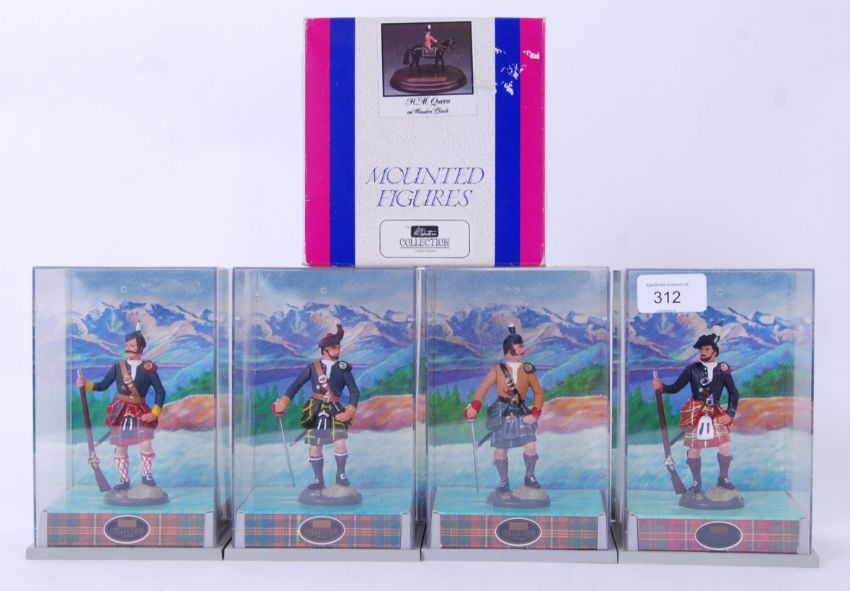 BRITAINS: A collection of 4x Britains ' Clansman Collection ' diecast model figures. Each highly detailed, unused, within the original boxes. Along with a Britains ' 8107 Mounted HM Queen Elizabeth ,' also within the original box.