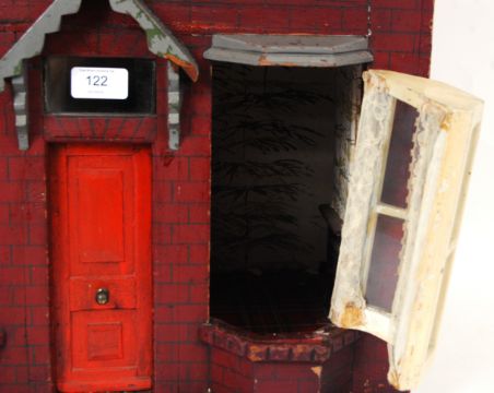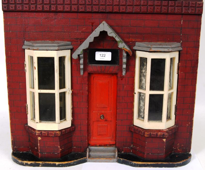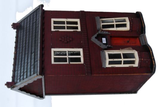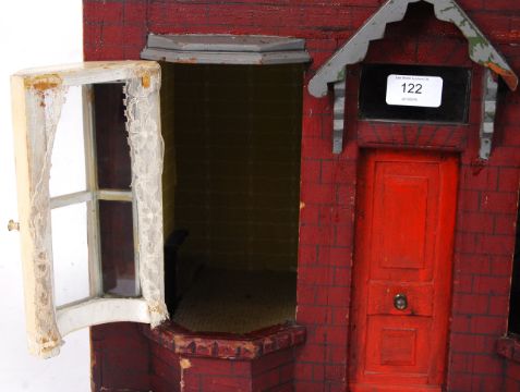 VICTORIAN DOLLS HOUSE: A charming Victorian late 19th / early 20th century well proportioned made dolls house. Typical Victorian style house, with painted red bricks, and bay windows to the front. Access to rooms through the opening glazed windows and door. Nicely detailed. 87cm tall x 51cm wide x 37cm deep. Built but the great grandfather of the vendor, and remained in the family ever since.