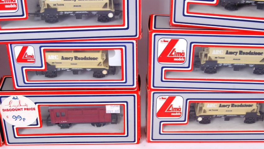 LIMA: A collection of 10x Lima 00 gauge railway trainset carriages and wagons - mostly 305636W Amey Roadstone wagons, but some others also. All in boxes.